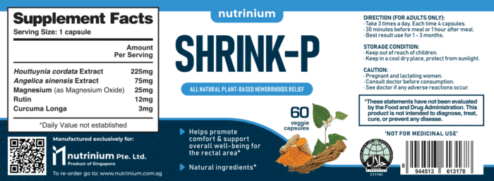 Shrink P is the ultimate all-natural, plant-based solution for hemorrhoid relief. Formulated with five powerful, scientifically-backed ingredients—Houttuynia Cordata, Angelica Sinensis, Magnesium Oxide, Meriva Curcumin, and Rutin—this supplement helps reduce hemorrhoid pain, swelling, and itchiness while promoting better circulation and strengthening the colon to prevent relapses. Offering fast relief within 48 hours, Shrink P is the perfect alternative to chemical treatments, with no side effects and Halal certification. Manufactured in Singapore and backed by a money-back guarantee, Shrink P provides an effective, natural remedy for hemorrhoids and piles, helping you say goodbye to discomfort and pain. Try it today for quick and lasting relief!